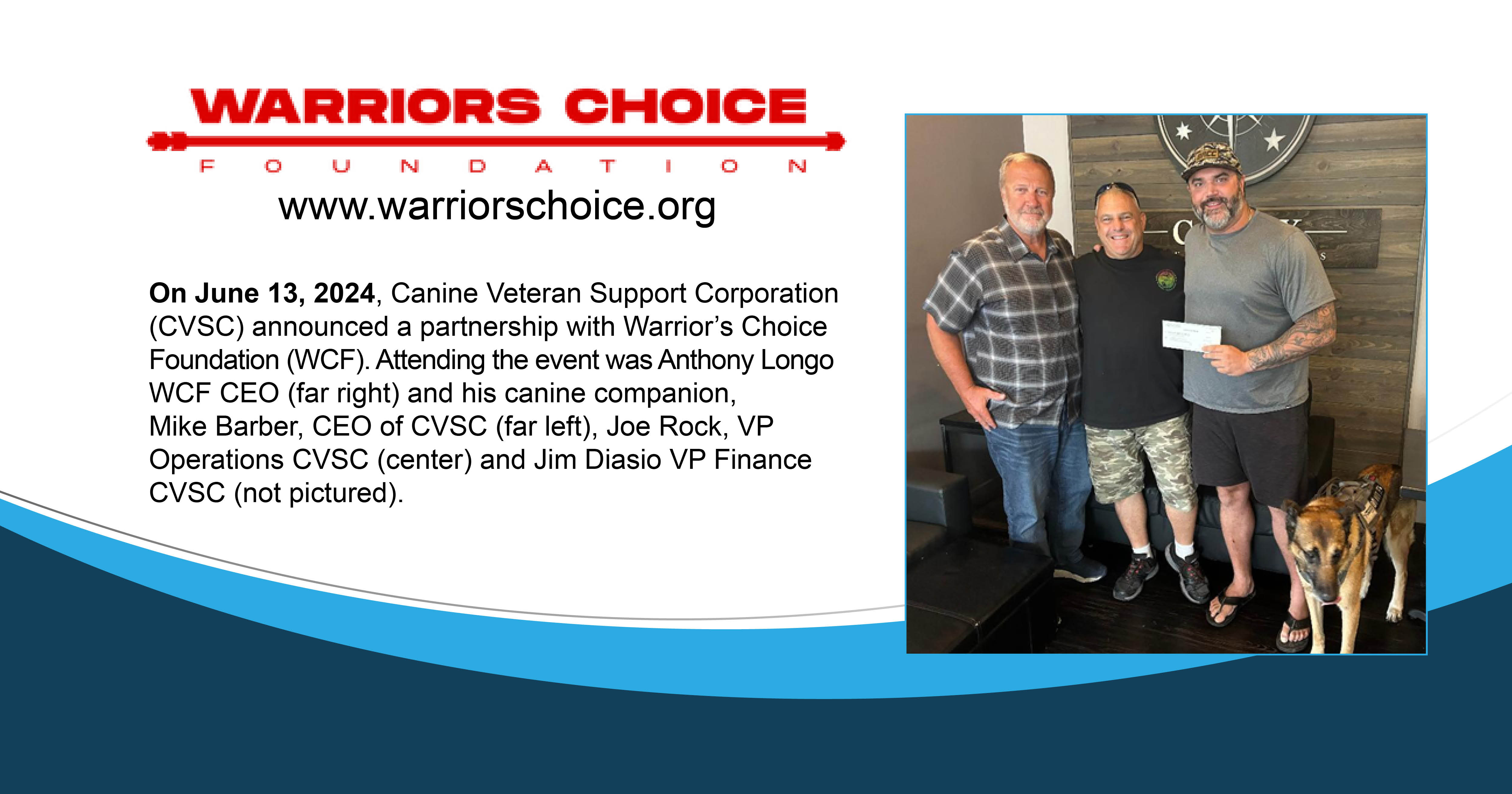Canine Veterans Support Corporation (CVSC) is a charitable organization, based in Palm Beach Gardens, Florida, currently joining forces with Warriors Choice Foundation and K-9 for Warriors. Research has proven that Service Dogs help reduce veteran suicides, lessen debilitating symptoms of PTSD, TBI and other traumas and enable veterans to live more productive lives within their communities. CVSC was formed to help connect our veterans with the funding and resources needed to gain canine support. In addition, CVSC will also offer Veterans direct support based on needs, finances, and capabilities.